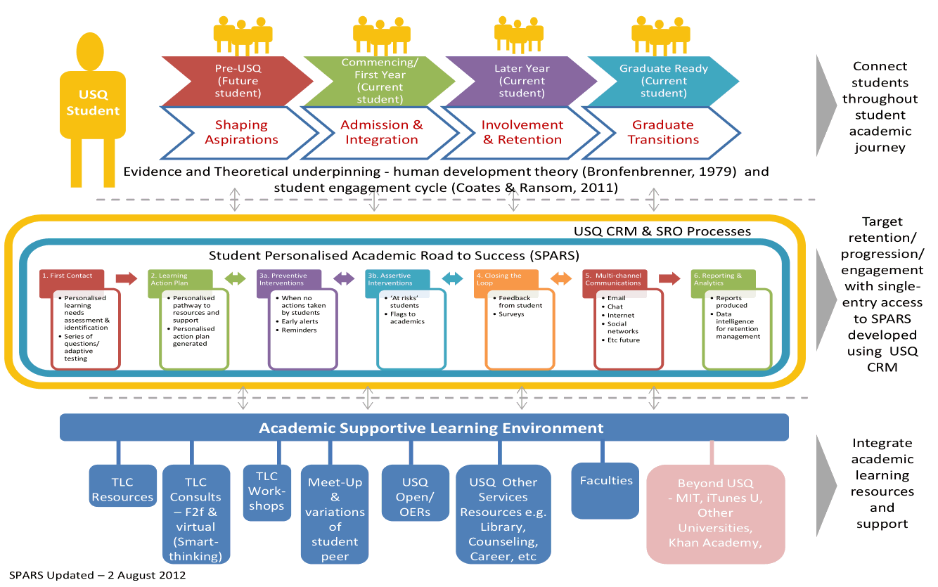 At present, USQ, as part of a University Participation & Partnership Program (UPPP) grant, is looking at its support program offerings as a means of improving student retention rates and increasing the number of domestic students from low socio-economic status (SES) backgrounds. The framework of this program, called the Student Personalised Academic Road to Success (SPARS):